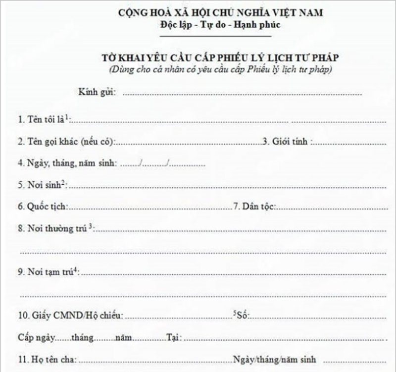 - Họ tên, giới tính, nơi sinh, ngày tháng năm sinh, quốc tịch, nơi cư trú, số CMND hoặc hộ chiếu, họ tên của cha, mẹ, vợ, chồng của người được cấp lý lịch tư pháp.